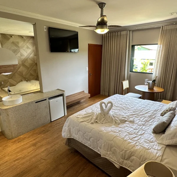 Este espaço conta com hidromassagem, estacionamento, TV LED, ar condicionado, frigobar, interfone, mesa e duas cadeiras. Eleve sua estadia com nossos pacotes especiais, incluindo cesta de chocolate ou frutas, bebida especial, velas na banheira, 2 roupões e palavras decorativas.